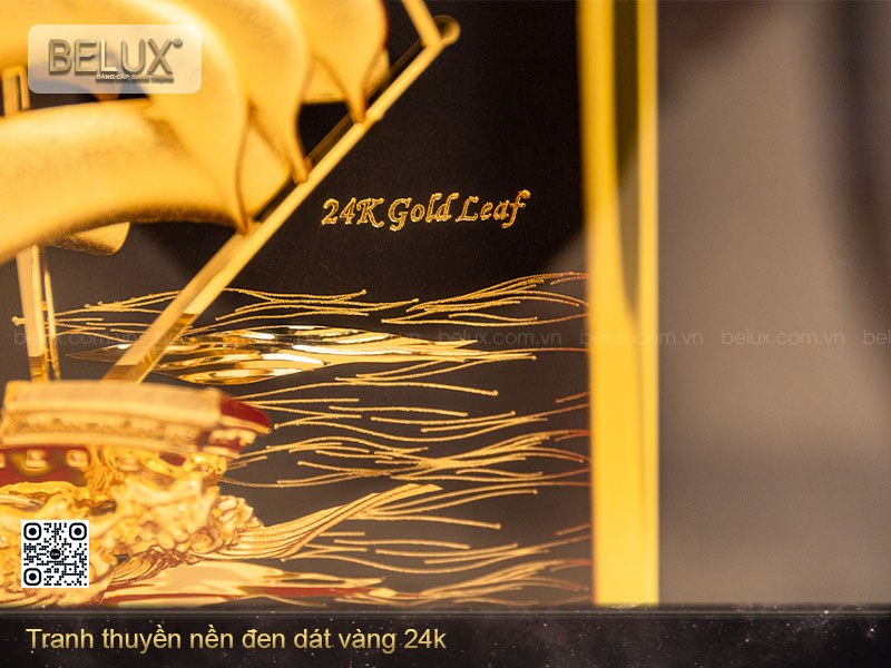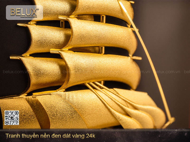 Tranh thuận buồm ở đây mang vẻ đẹp tinh tế, sang trọng, cuốn hút. Bức tranh tái hiện hình ảnh con thuyền căng buồm, lênh đênh trên sóng biển dập dình, thuận theo chiều gió mà tiến thẳng về đích. Dưới đôi bàn tay tài hoa của những người nghệ nhân, hình ảnh con thuyền hiện lên sinh động với những đường nét mềm mại, uyển chuyển, rõ ràng, chính xác đến từng chi tiết. Con thuyền, sóng nước, may trời được dát vàng 24k sáng bóng nổi bật trên nền và khung tranh màu đen. Màu vàng là màu của quý tộc, mang đến sự giàu sang, thịnh vượng.